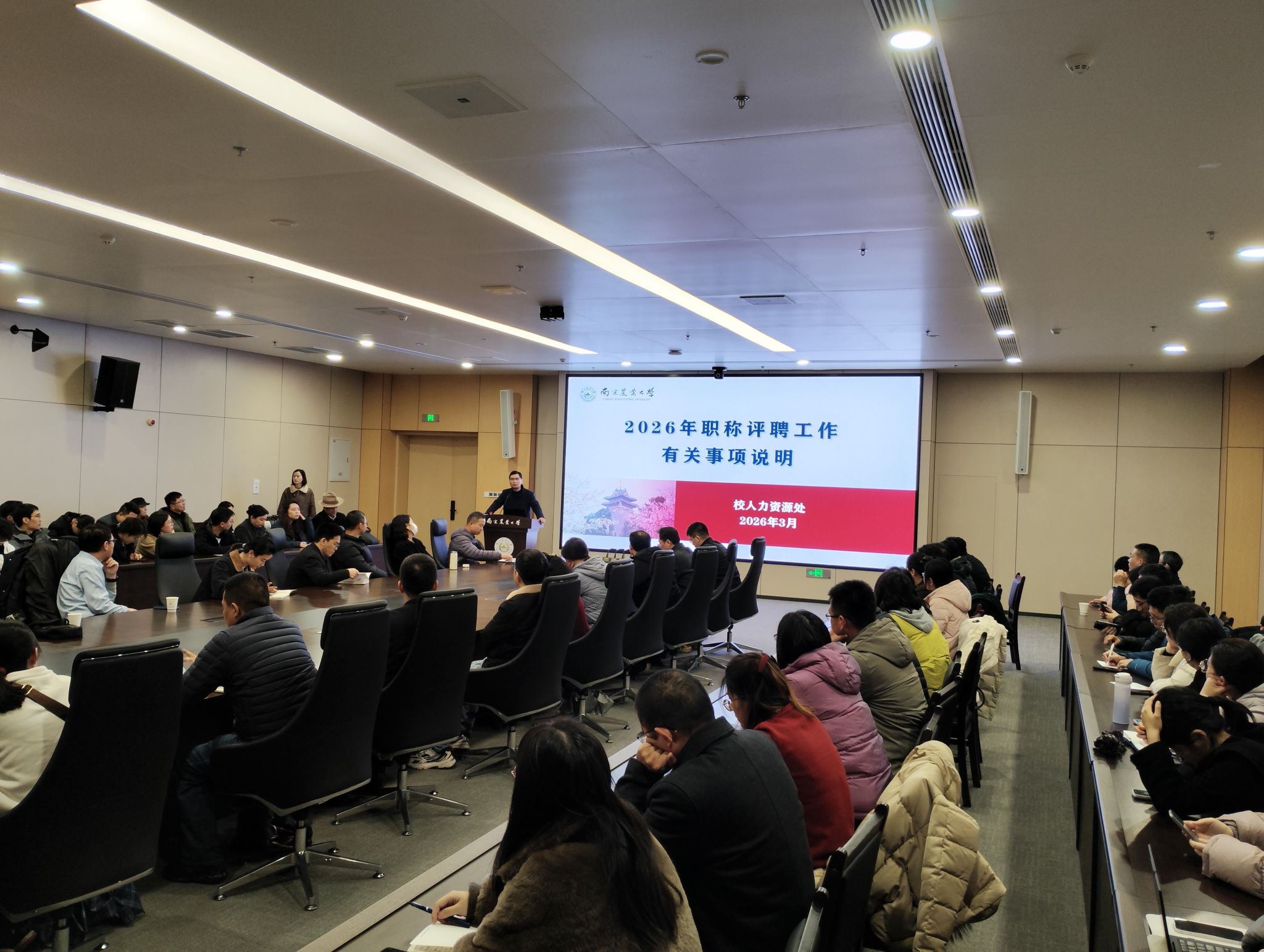 3月18日、19日,人力资源处先后在滨江、卫岗两校区举办2026年职称评聘工作说明会。各学院(单位)拟申报晋升职称人员、人事秘书等参加说明会。会议由人力资源处副处长袁家明主讲。