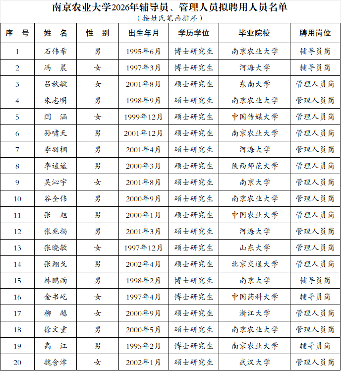 根据南京农业大学2026年辅导员、管理人员招聘工作有关要求,经过个人报名、资格审查、线上面试、线下笔试、线下面试、心理测评、体检和政审等程序,确定石伟希等5名同志为辅导员岗位拟聘用人员、吕秋敏等15名同志为管理人员岗位拟聘用人员,现予公示。如拟聘用人员放弃聘用资格,学校按照考核成绩从高分到低分依次递补,对体检和政审合格的递补人员补充公示。
